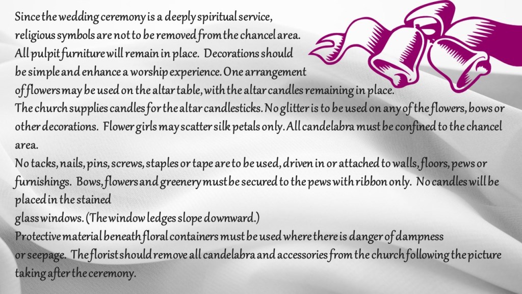 NOTE: You are not required to have organ music at your wedding. But if the sanctuary pipe organ is used, you are required to use our organist or an organist that we supply.